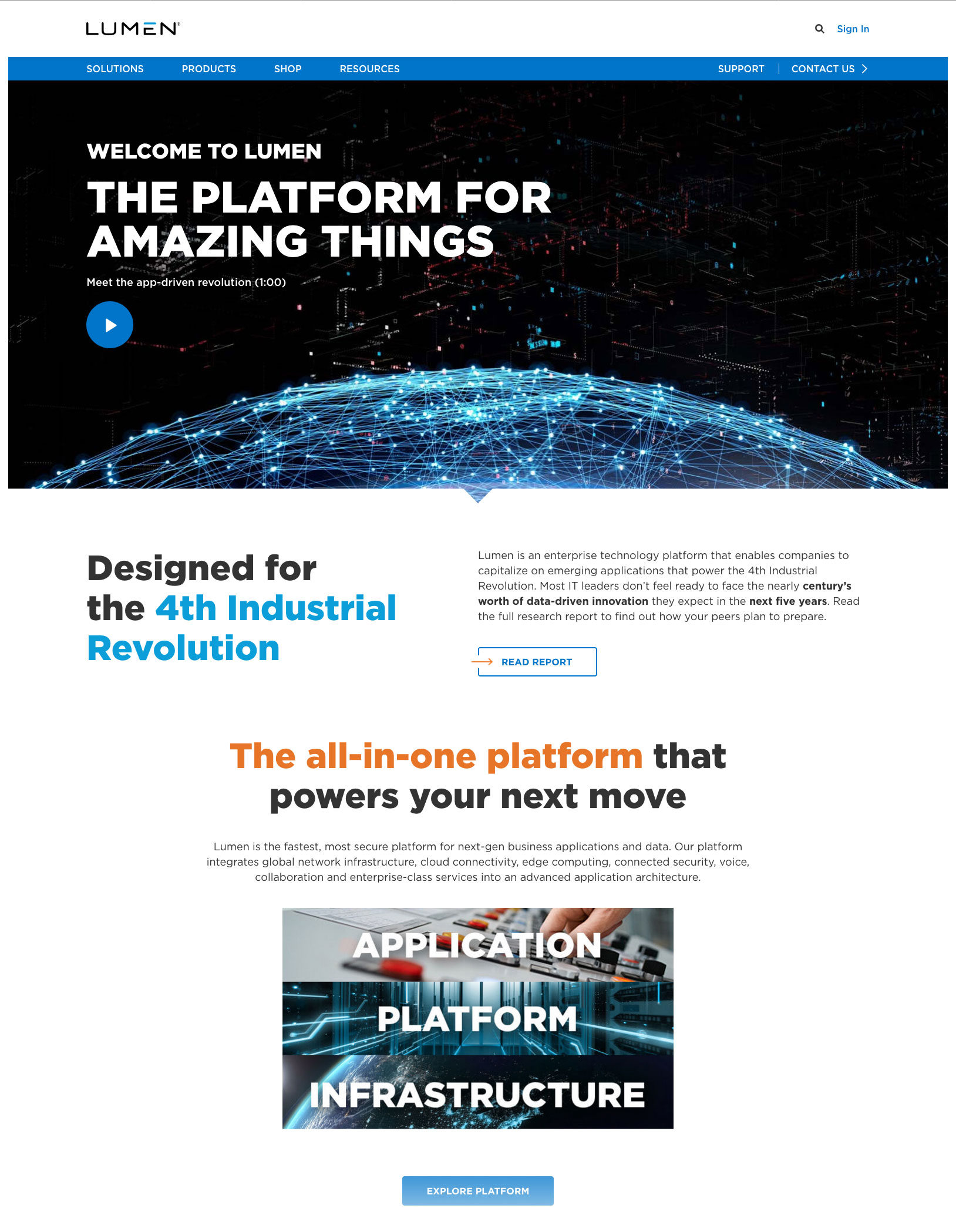 But this was far more than a typical rebrand. Lumen was a strategic leap to focus exclusively on B2B, shifting the residential market to a subsidiary keeping the name CenturyLink. We also had to create connective tissue between our products under the new banner of "The platform for amazing things." Even the name signaled our direction: After years of CenturyLink's "Night" aesthetic (described in brand guidelines as "vibrant, bold, luminescent and professional" and featuring people in dark offices at night, faces lit up by their devices), Lumen literally stepped into the light.