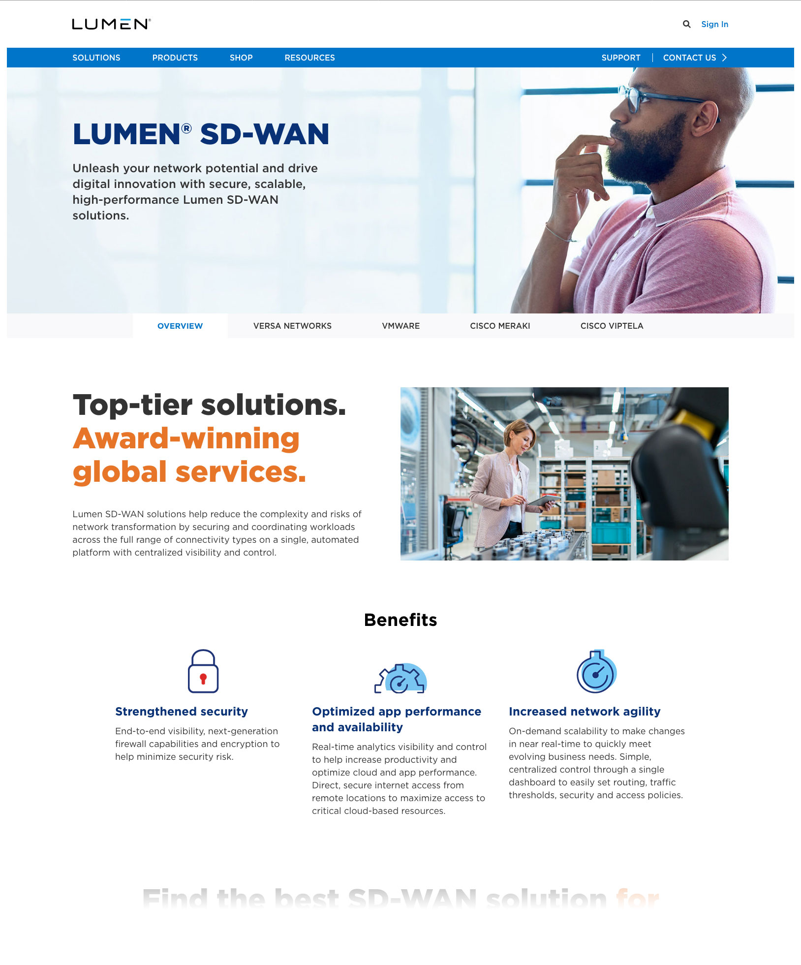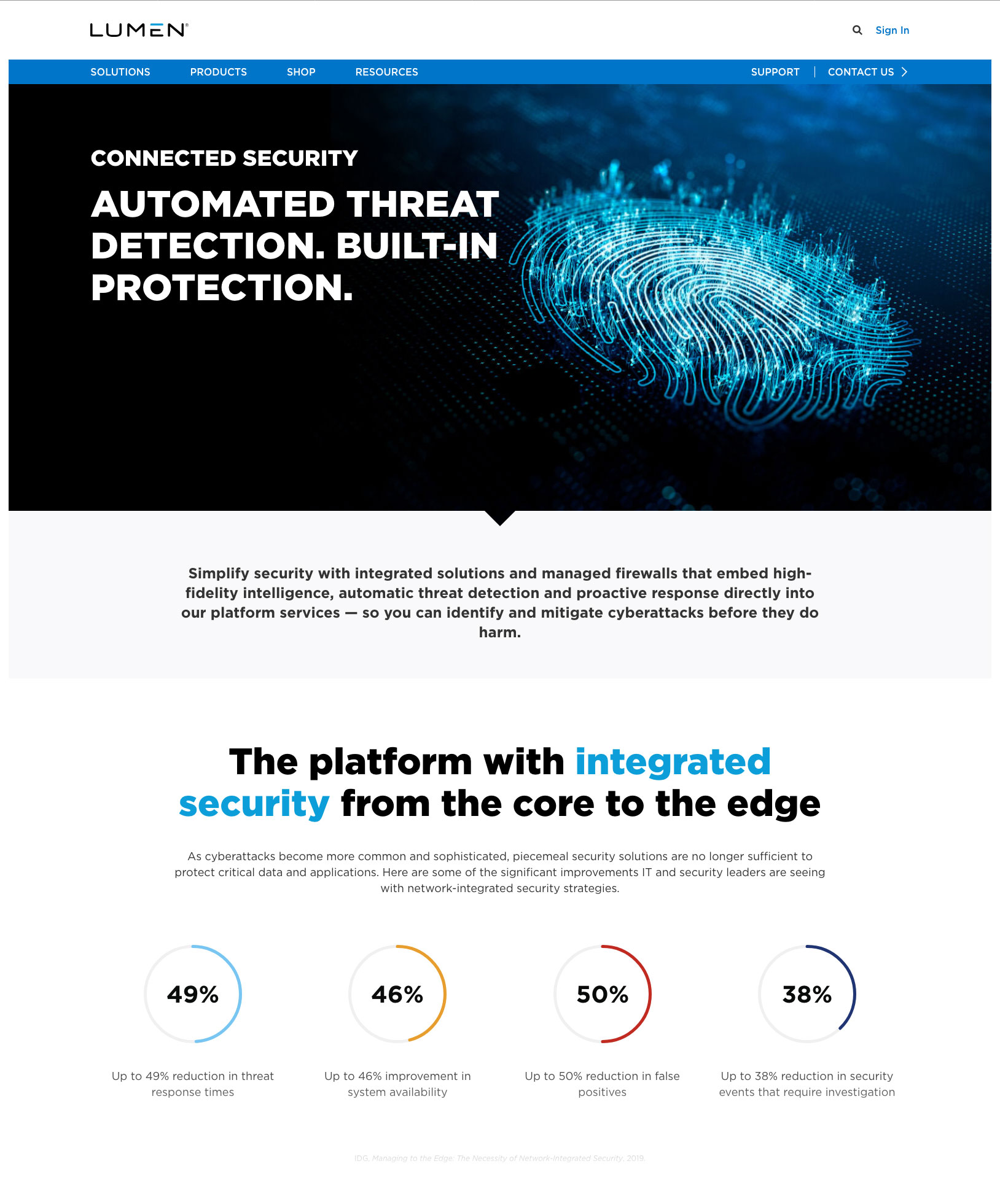 Solution pages were stunning, with large web heroes covering industries (i.e. healthcare, retail) and specific enterprise challenges (i.e. security). With a large hero image similar in size to the homepage, these featured interactive elements that my team designed, extending our icon system with custom illustrations.